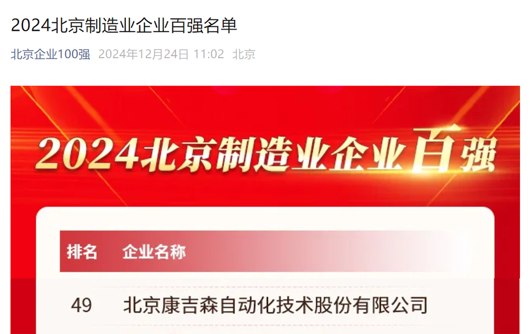 2024年12月24日,“2024京津冀產(chǎn)業(yè)鏈供應(yīng)鏈協(xié)同發(fā)展大會暨北京百強企業(yè)論壇”發(fā)布了2024北京企業(yè)百強榜單,北京康吉森自動化技術(shù)股份有限公司(以下簡稱“康吉森股份”)榮登“2024北京制造業(yè)企業(yè)百強”“2024北京專精特新企業(yè)百強”榜單。